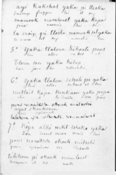 When I say that this Chinuk Wawa is fluent, I’m saying that it’s totally characteristic stuff from what I’ve now come to call the Central Dialect. That’s the oldest variety of the language, the early-creolized Jargon associated with Fort Astoria and Fort Vancouver. The document we’re looking at here was created before the Northern or Southern dialects (associated with British Columbia and with Oregon’s Grand Ronde Reservation, respectively) even existed.