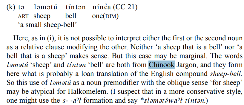 It’s just that he doesn’t go the one additional step, to explicitly tell you that ləmətú tíntən is a perfectly formed Noun+Noun compound, according to the rules of Northern Chinook Jargon grammar!