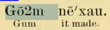 JK Gill’s famous 1909 Chinook Jargon dictionary, page 50, in fact gives us “goom, or la-goom” for ‘pitch; resin’!