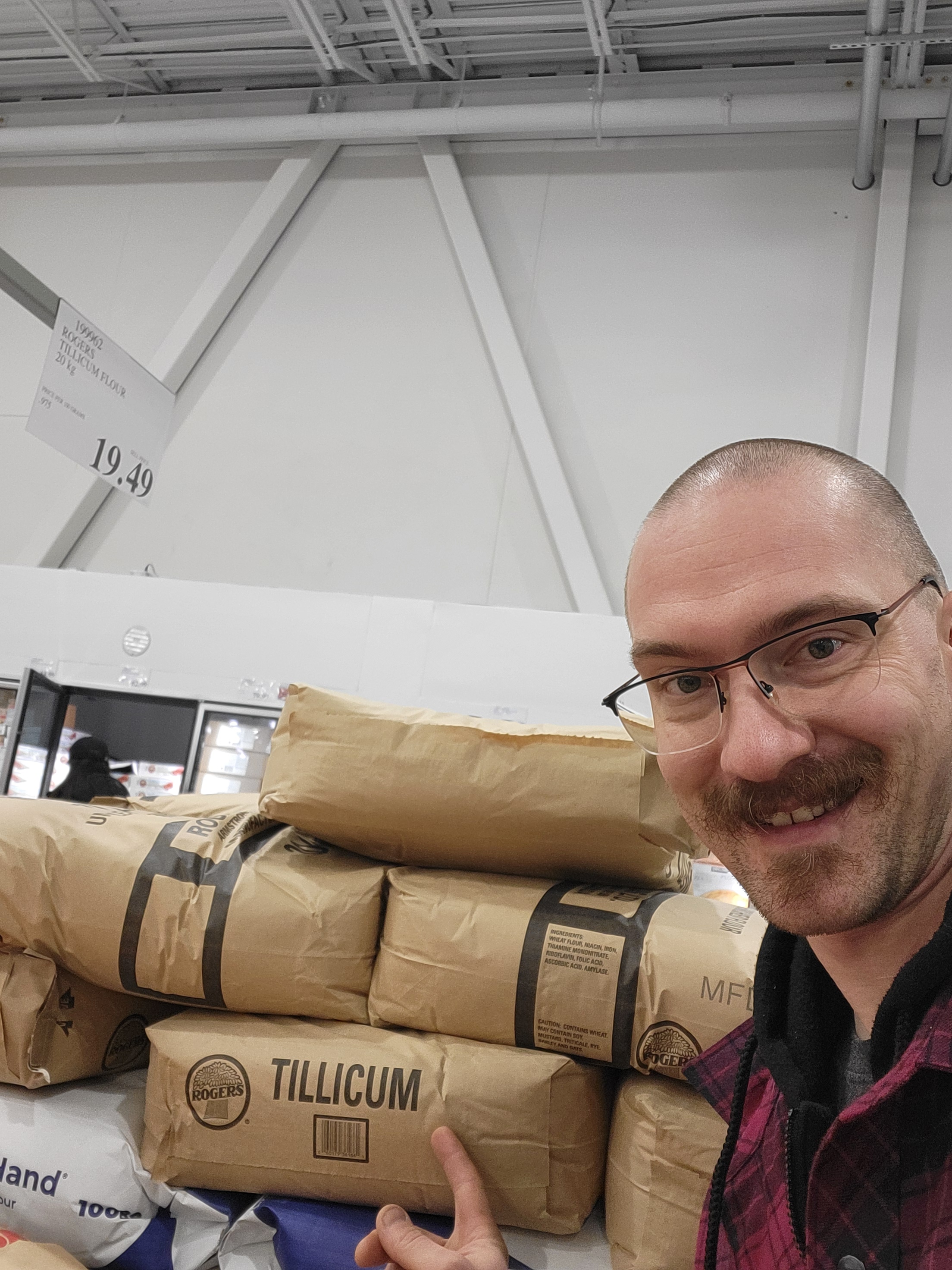 Here you see Northern Chinook Jargon speaker Maxwell indicating his find of Tillicum (tilihum / tílixam) Flour at a store in British Columbia the other day.