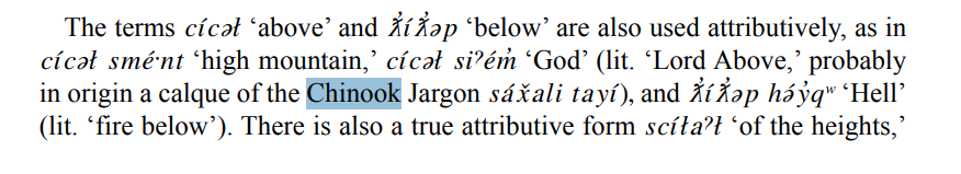 This is an ongoing open question in research on the Pacific Northwest. Did the notion of Creator as a ‘sky chief’ get introduced by non-Indigenous people, or was it here already? I don’t know how we could ever resolve it. At this point I’ll point out some more words seen in the Musqueam Reference Grammar that we know from Northern Chinook Jargon: pípə ‘paper’ and púkʷ ‘book’ (p. 506), ʔáwə ‘hour’ and mə́nəc ‘minute(s)’ (p. 511).
