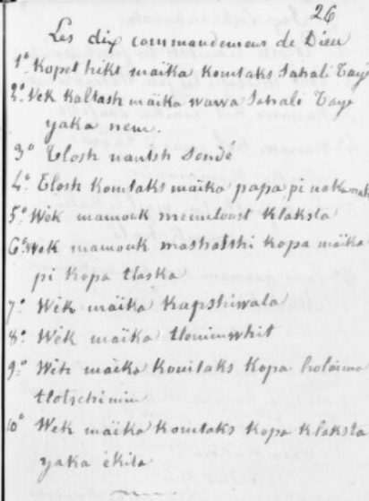 ‘1st: I am the Lord thy God. Thou shall not have strange gods before Me.’2o Wek kaltash maïka wawa Sahalé Tayé yaka nem.
