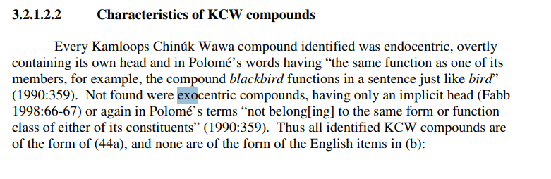 There isn’t yet much of a linguistic literature on Chinuk Wawa compounds. That’s one reason why I wrote my dissertation. Now it’s time to expand on my observations, and on those of Henry Zenk (1993), who may have been the first to comment on the endocentric ones.