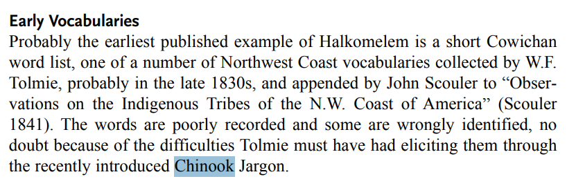 Probably the earliest published example of Halkomelem [the language of which Musqueam is one variety] is a short Cowichan word list, one of a number of Northwest Coast vocabularies collected by W.F. Tolmie, probably in the late 1830s, and appended by John Scouler to “Observations on the Indigenous Tribes of the N.W. Coast of America” (Scouler 1841). The words are poorly recorded and some are wrongly identified, no doubt because of the difficulties Tolmie must have had eliciting them through the recently introduced Chinook Jargon.