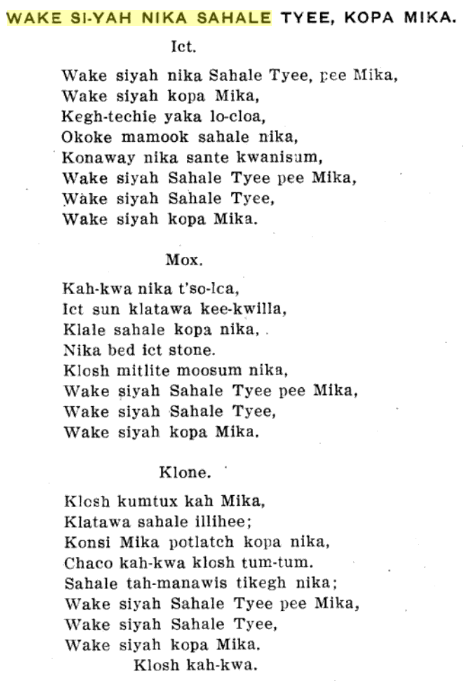 1914: LBDB’s “Chinook-English Songs”, part 11 of 15 “Wake Si-yah Sahale Tyee, Kopa Mika”