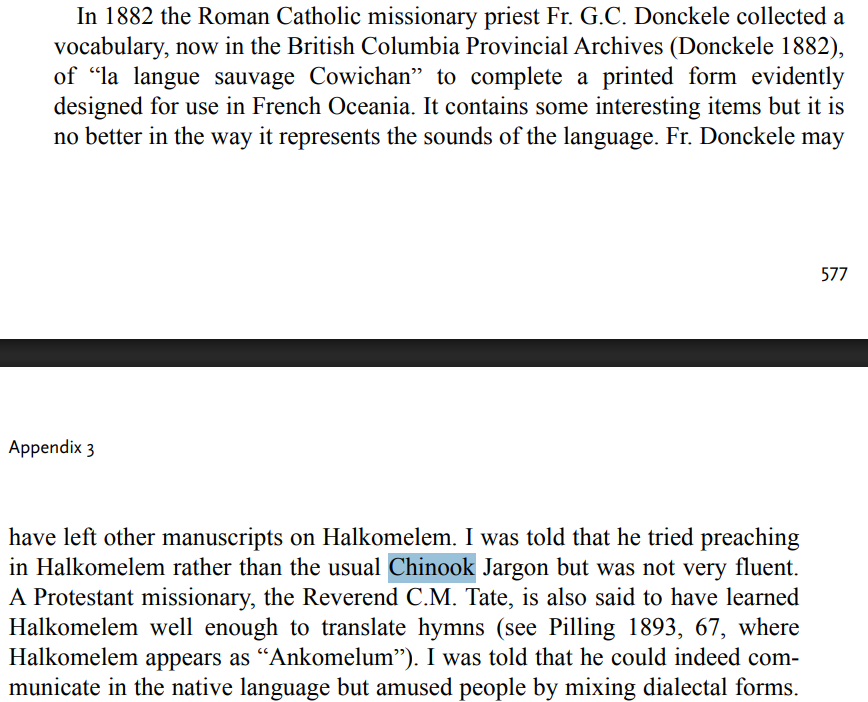 In 1882 the Roman Catholic missionary priest Fr. G.C. Donckele collected a vocabulary, now in the British Columbia Provincial Archives (Donckele 1882), of “la langue sauvage Cowichan” to complete a printed form evidently designed for use in French Oceania. It contains some interesting items but it is no better in the way it represents the sounds of the language. Fr. Donckele may have left other manuscripts on Halkomelem. I was told that he tried preaching in Halkomelem rather than the usual Chinook Jargon but was not very fluent. A Protestant missionary, the Reverend C.M. Tate, is also said to have learned Halkomelem well enough to translate hymns (see Pilling 1893, 67, where Halkomelem appears as “Ankomelum”). I was told that he could indeed communicate in the native language but amused people by mixing dialectal forms.
